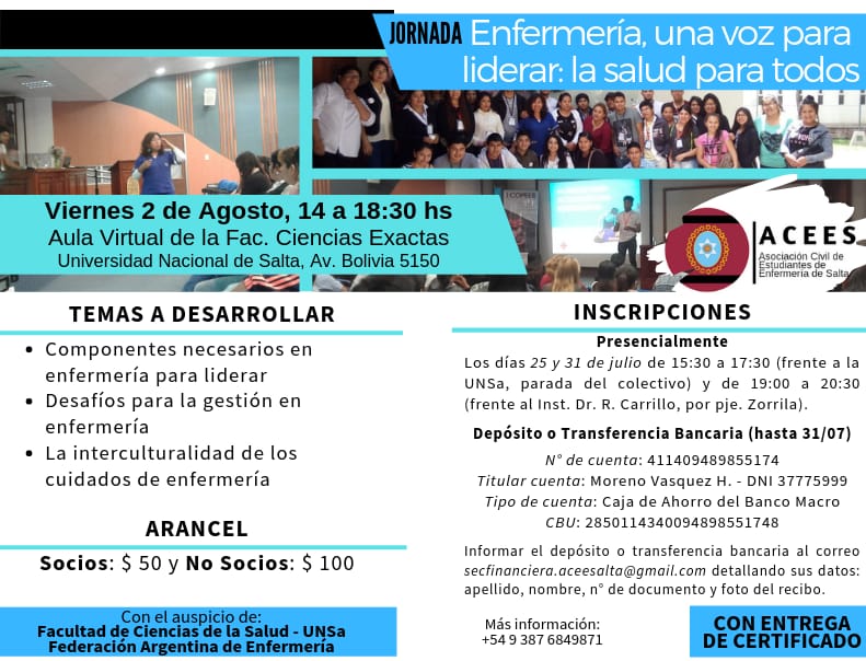 La capacitación es organizada por la Asociación Civil de Estudiantes de Enfermería de Salta, el arancel para los socios en de $50 mientras que para los no socios es de $100. La certificación la realizará acees.