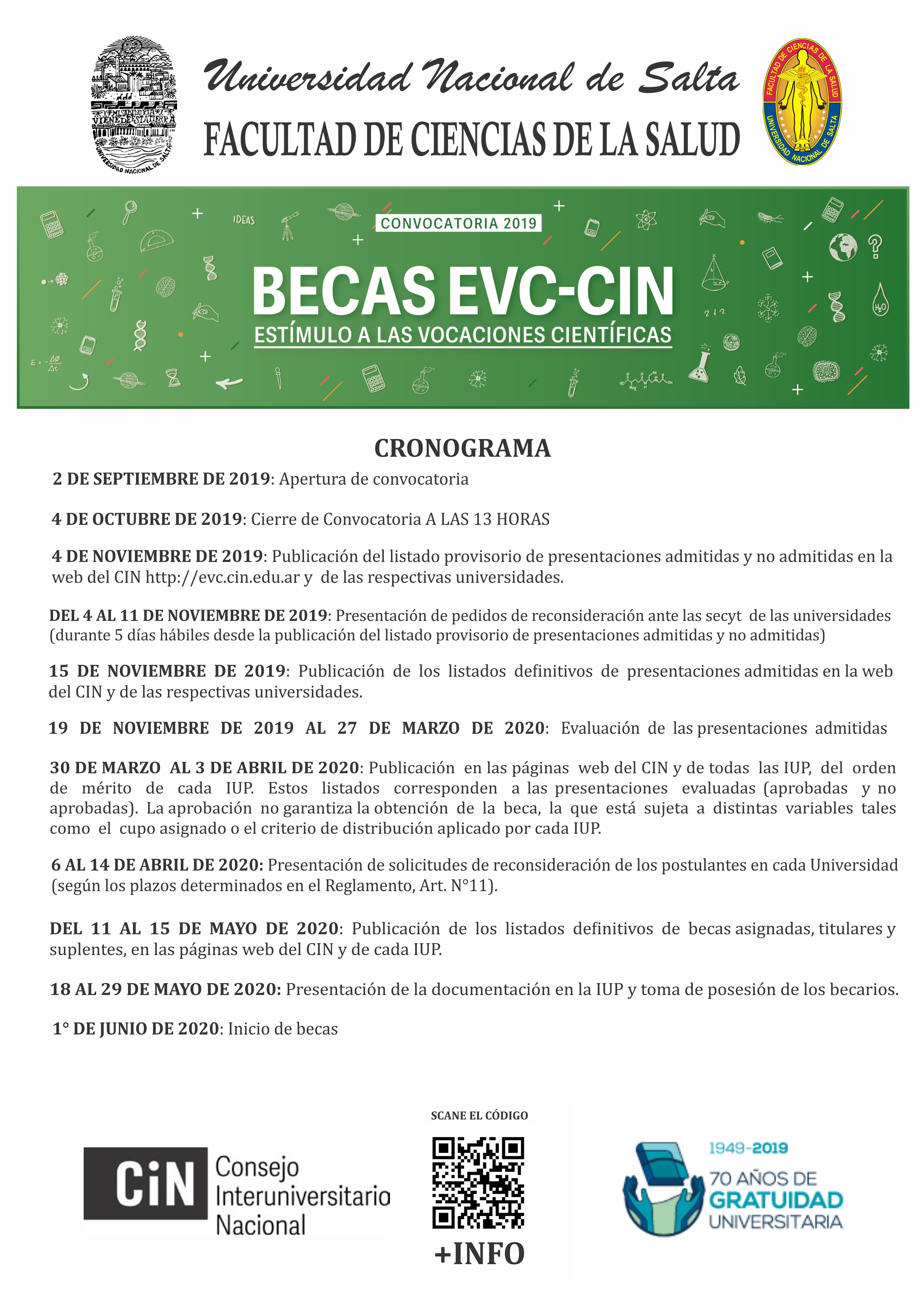 Se podrán postular a Becas EVC estudiantes avanzados de la Universidad Nacional de Salta, que no superen los 30 años de edad al 31 de diciembre del año de la convocatoria (inclusive), con un promedio de al menos seis (6) puntos (incluidos aplazos) con mínimo el 50% de las materias del plan de estudio de la carrera que cursa, al momento del cierre de inscripción del concurso de beca. Los trabajos realizados durante el desarrollo de la beca podrán utilizarse en la elaboración de una tesis de grado.