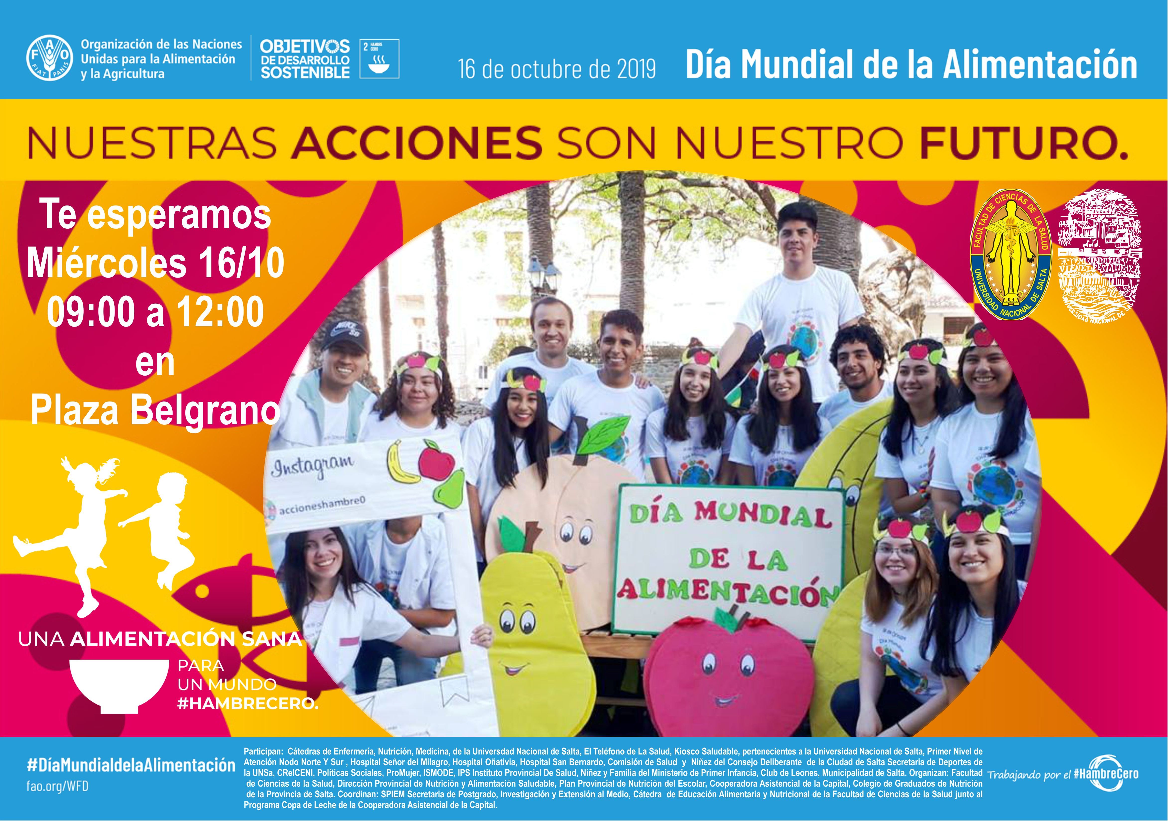 La Secretaría de Postgrado, Investigación y Extensión al Medio, invita a la comunidad salteña a celebrar el Día Mundial de la Alimentación, el evento se desarrollará, el miércoles 16 de octubre, de 9:00 a 12:00, en la Plaza Belgrano, se realizará toma de peso y talla junto con el Índice de Masa Corporal, para que te lleves recetarios y cuides tú Salud.
