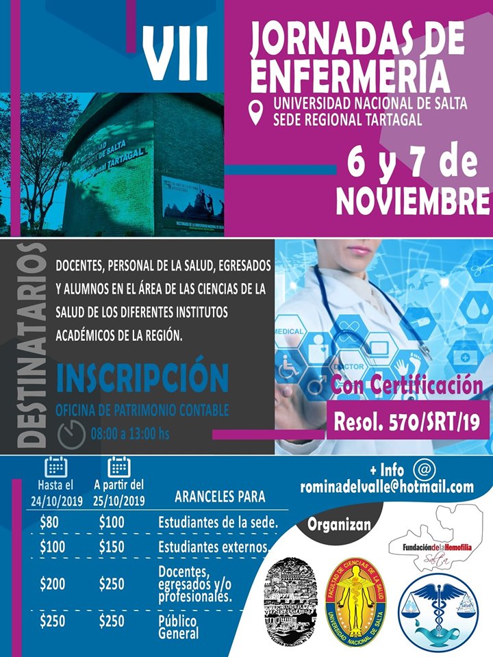 La Secretaría de Postgrado, Investigación y Extensión al Medio, comunica que en la sede Regional Tartagal se va a realizar las VII JORNADAS DE ENFERMERÍA los días 6 y 7 de Noviembre.