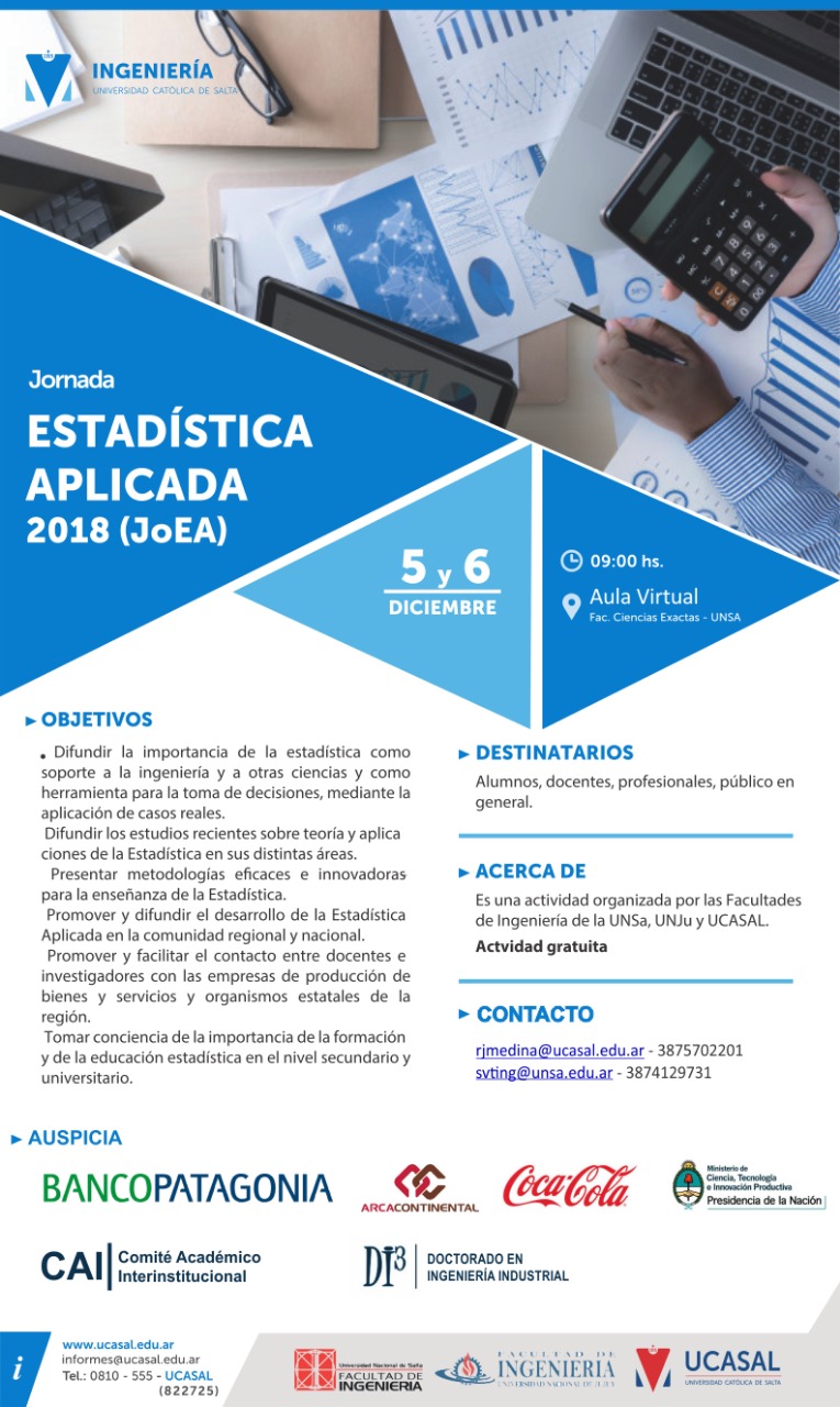 Las II Jornadas Internacionales de Estadística Aplicada son organizadas por la Facultad de Ingeniería de la UNSa, UNJu, UCASAL y Faculta de Ciencias Exactas de la UNSa.