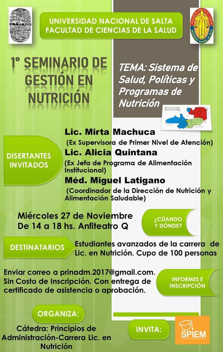 La Secretaría de Postgrado, Investigación y Extensión al Medio, invita a los alumnos avanzados de la carrera de Lic. en Nutrición, al I SEMINARIO DE GESTIÓN EN NUTRICIÓN, que se desarrollara el Miércoles 27 de Noviembre de 14:00 a 18:00 hs, en el Anfiteatro Q.
