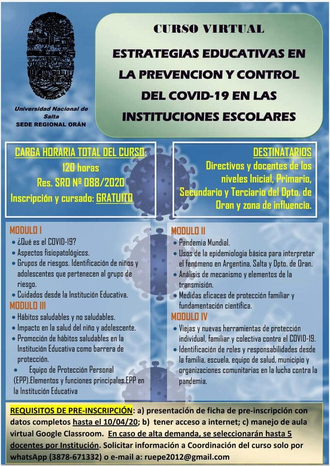 La Secretaría de Postgrado, Investigación y Extensión al Medio, informa del Curso Virtual en Orán: "ESTRATEGIAS EDUCATIVAS EN LA PREVENCIÓN Y CONTROL DEL COVID-19 EN LAS INSTITUCIONES ESCOLARES", con una carga horaria de 120 hs. Dirigida a directivos y docentes del nivel inicial, EGB, Nivel Medio y Nivel Superior no Universitario.
