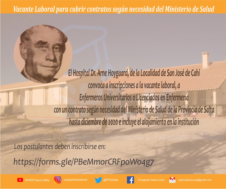 La Secretaría de Postgrado Investigación y Extensión al Medio informa que el Hospital Dr. Arne Hoygaard, de la Localidad de San José de Cahi, convoca a inscripciones a la vacante laboral, según necesidad hasta diciembre de 2020 e incluye el alojamiento en la institución.