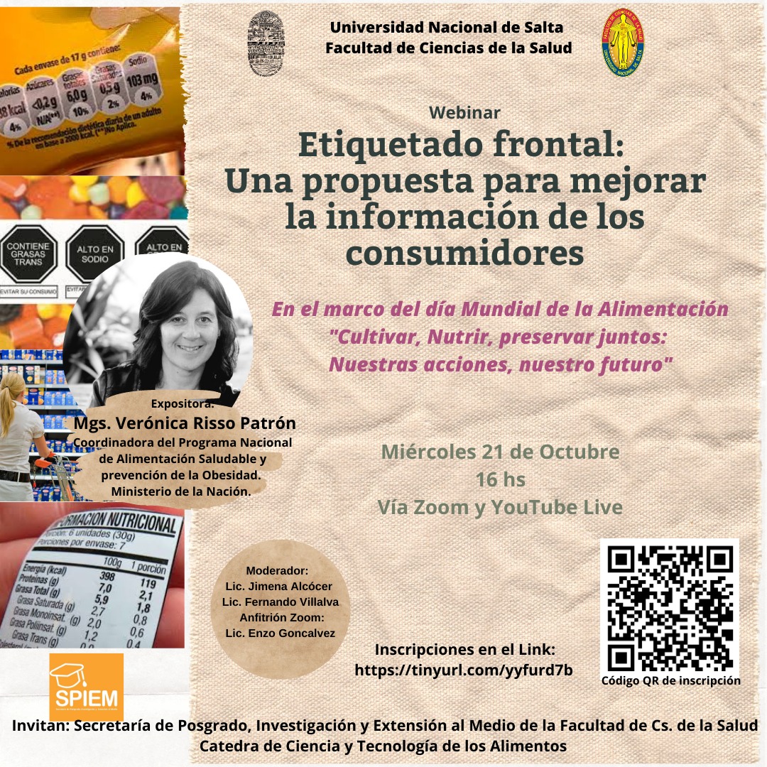 Los interesados en participar del encuentro virtual que se desarrollará el Miércoles 21/10 a las 16:00 hs en el que disertará la Mg. Verónica Risso Patrón, Coordinadora del Programa Nacional de Alimentación Saludables y prevención de la Obedsidad del Ministerio de la Nación. Quién en esta oportunidad disertará sobre el "ETIQUETADO FRONTAL: UNA PROPUESTA PARA MEJORAR LA INFORMACIÓN DE LOS CONSUMIDORES". Pueden registrar su inscripciones vía Formulario https://tinyurl.com/yyfurd7b o escaneando el código QR.