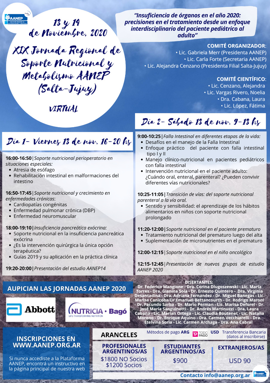 La Secretaría de Postgrado Investigación y Extensión al Medio, invita a los estudiantes y graduados de la Licenciatura en Nutrición a participar de las XIX Jornadas Regionales de Soporte Nutricional y Metabolismo AANEP (Salta-Jujuy)Virtual