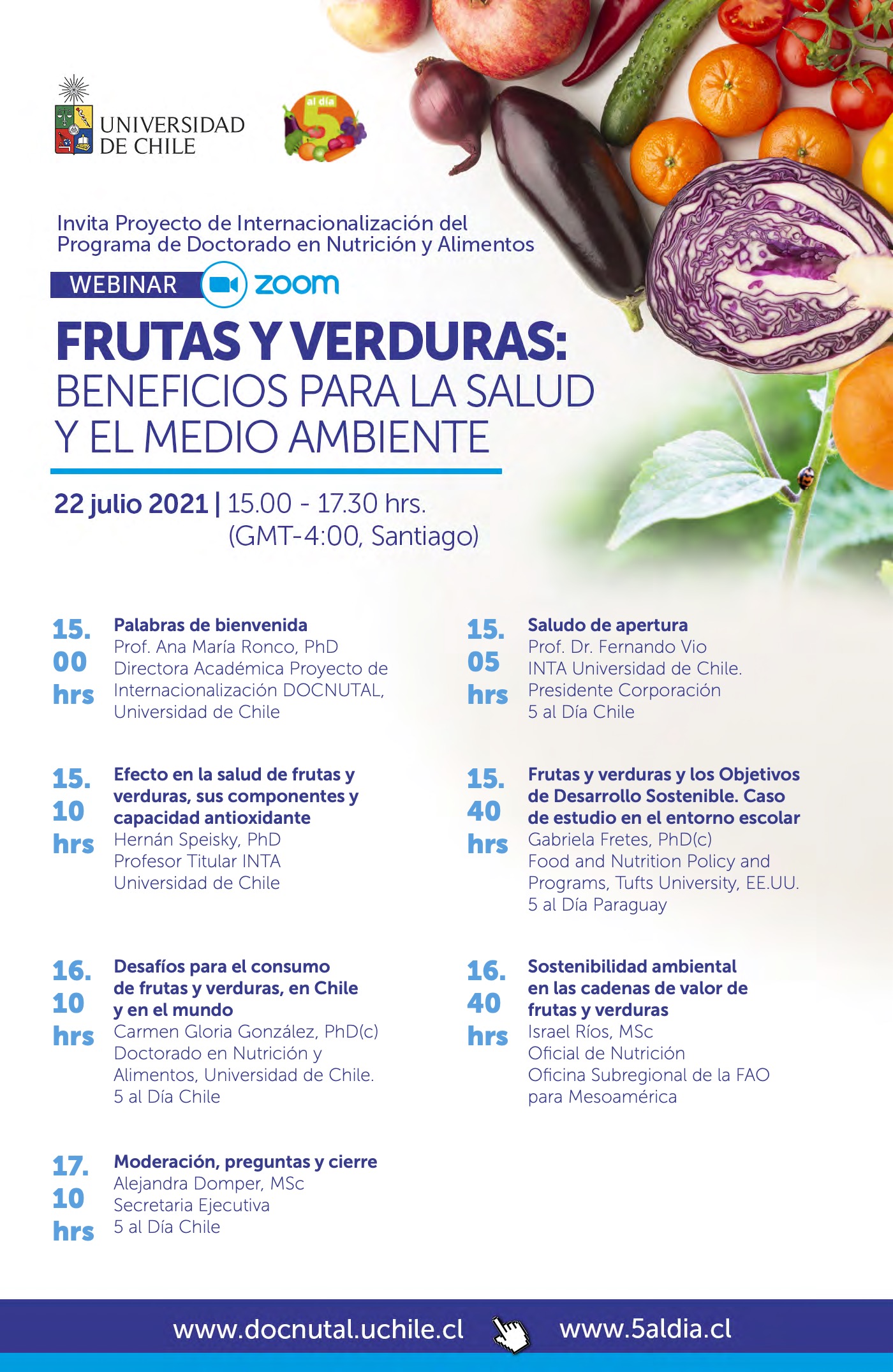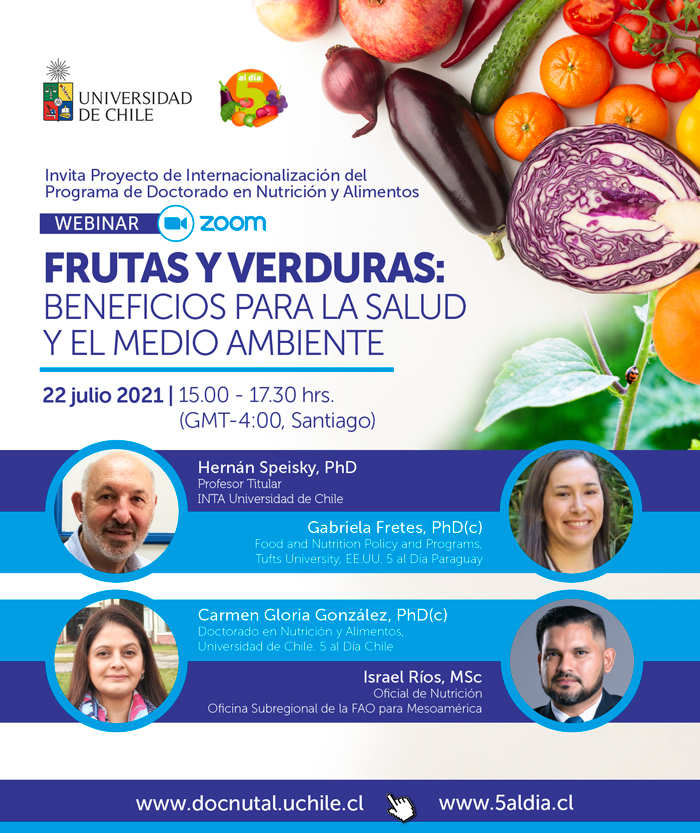 El Proyecto de Internacionalización del Programa de Doctorado en Nutrición y Alimentos (DOCNUTAL) de la Universidad de Chile y la Corporación 5 al Día de Chile, le invitan al Webinar “Frutas y verduras, sus beneficios para la salud y el medio ambiente”, el cual se realizará el próximo jueves 22 de julio, entre las 15:00 y 17:30 hrs. de Chile.