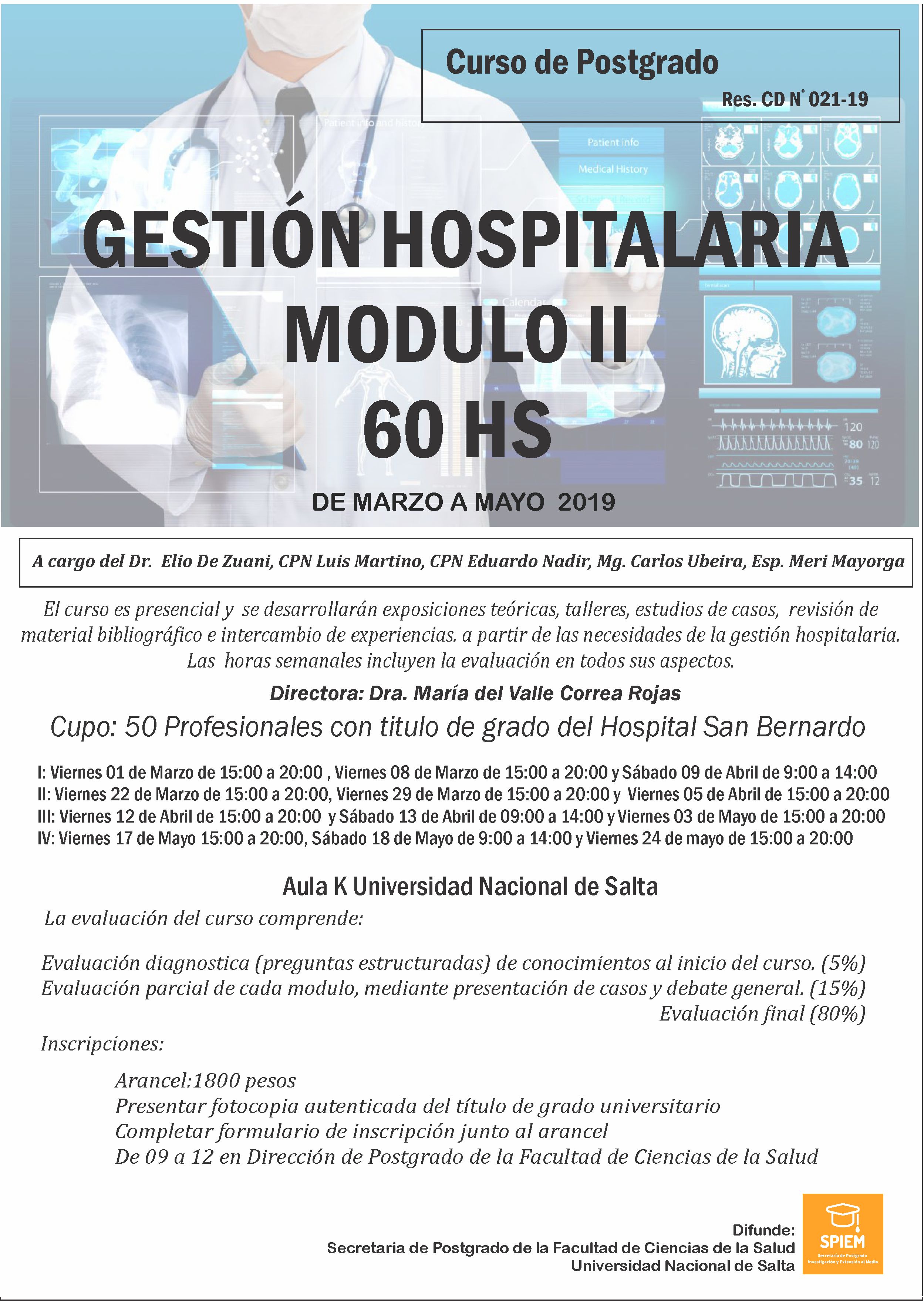 GESTIÓN HOSPITALARIA MODULO II Publicado: 22 Febrero 2019 Categoría: Uncategorised / CURSOS DE POSTGRADO Y ACTIVIDADES DE EXTENSIÓN